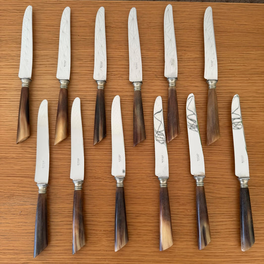 Antique French Dinner Steak Knives Horn Handles Silver Collar 12pcs 0302268